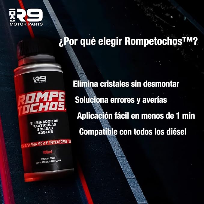 - Rompetochos disuelve los cristales sólidos que se forman en el sistema AdBlue, eliminando errores y obstrucciones sin desmontar nada. Solo verté la dosis en el depósito y seguí conduciendo. Limpieza profunda en pocos kilómetros.